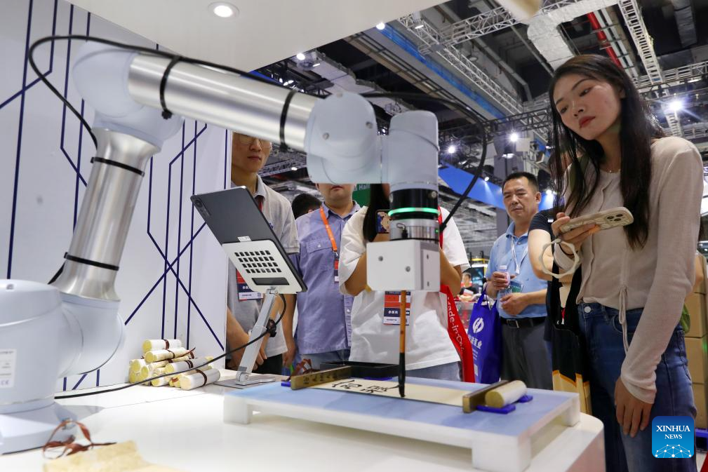 A robot writes Chinese calligraphy during the 23rd China International Industry Fair (CIIF) in east China's Shanghai, Sept. 19, 2023. The 23rd CIIF kicked off here on Tuesday, with the theme of "Digital Economy & Industrial Decarbonization." (Xinhua/Fang Zhe)