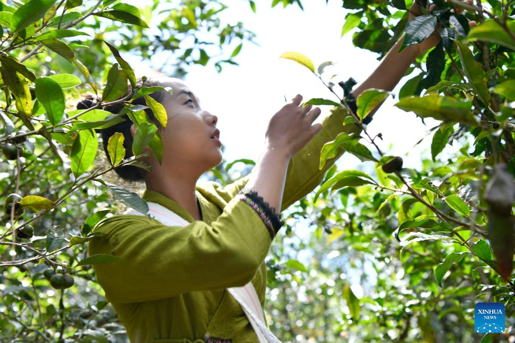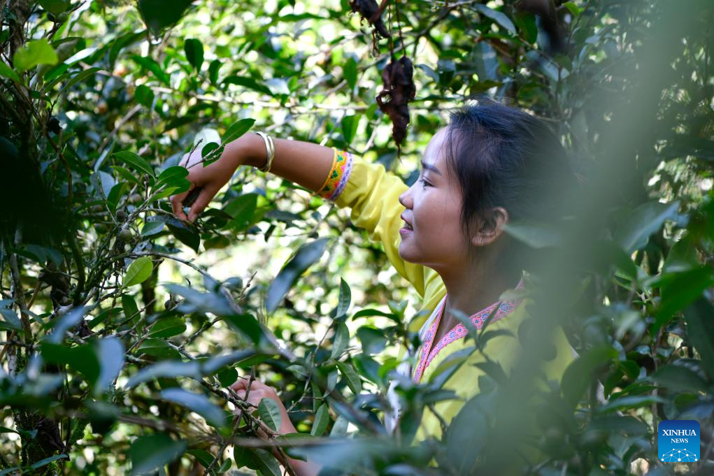 A tea farmer picks tea leaves in an old tea forest of the Jingmai Mountain in Pu'er, southwest China's Yunnan Province, Sept. 19, 2023. Local tea farmers here are busy picking tea leaves in harvest season to meet the market demand. (Xinhua/Tang Rufeng)