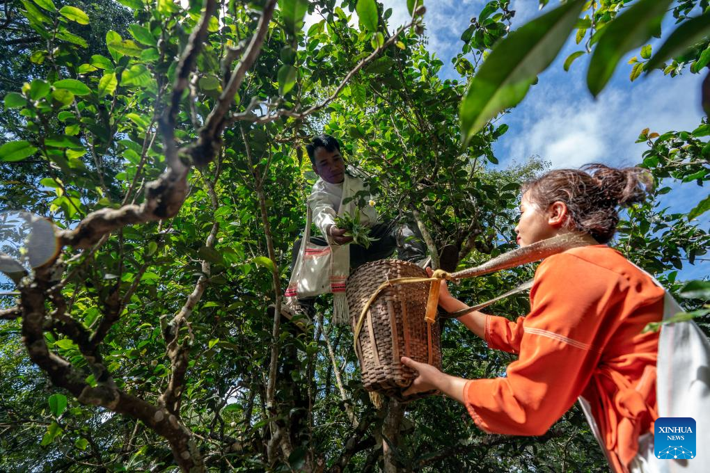 A tea farmer passes tea leaves to his companion in an old tea forest of the Jingmai Mountain in Pu'er, southwest China's Yunnan Province, Sept. 19, 2023. Local tea farmers here are busy picking tea leaves in harvest season to meet the market demand. (Xinhua/Tang Rufeng)