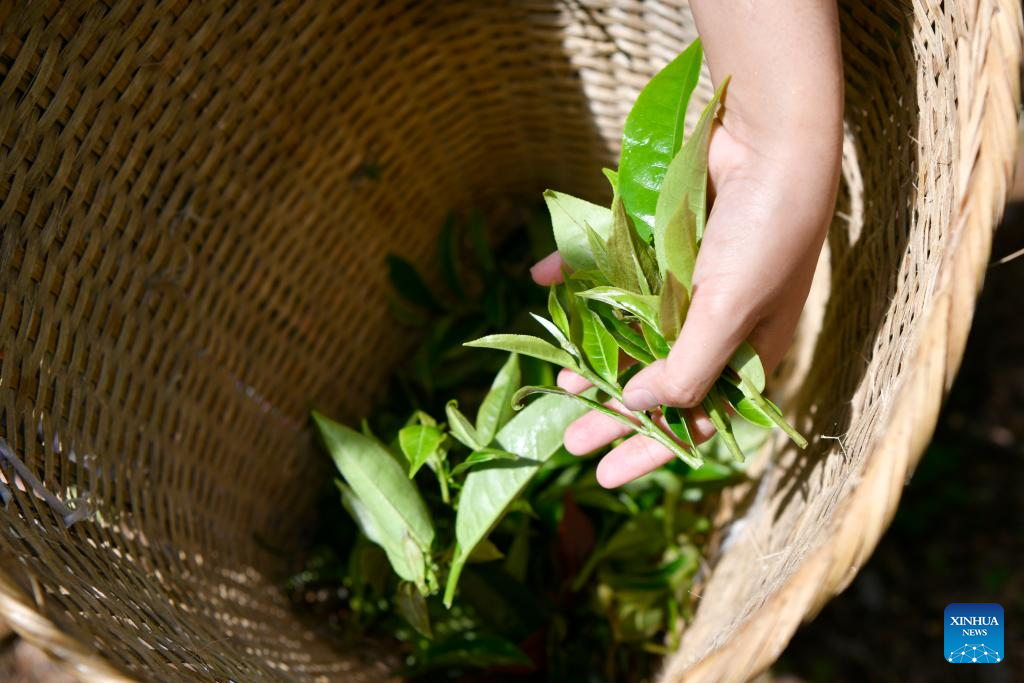 A tea farmer puts tea leaves into a basket in an old tea forest of the Jingmai Mountain in Pu'er, southwest China's Yunnan Province, Sept. 19, 2023. Local tea farmers here are busy picking tea leaves in harvest season to meet the market demand. (Xinhua/Hu Chao)