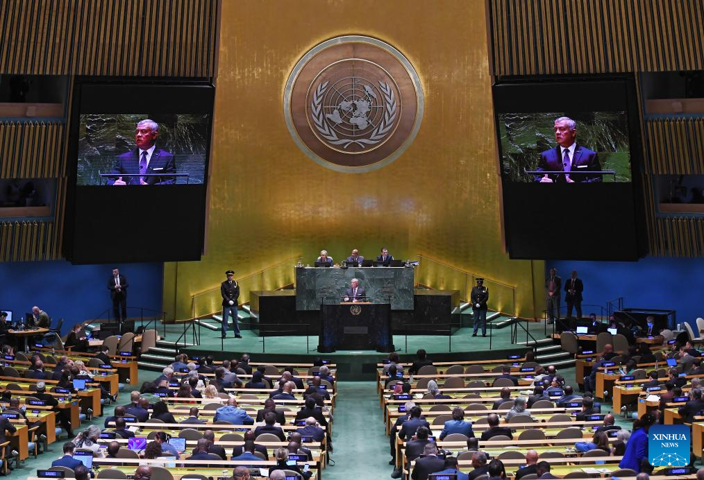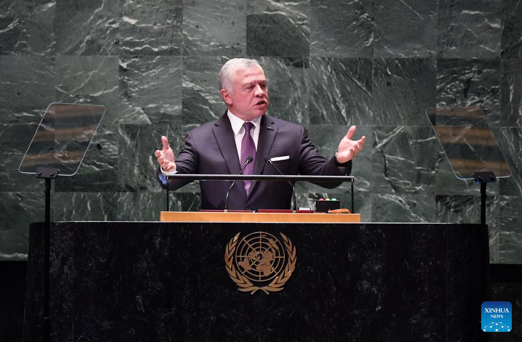 King Abdullah II of Jordan delivers a speech at the General Debate of the 78th session of the UN General Assembly at the UN headquarters in New York, on Sept. 19, 2023. The General Debate of the 78th session of the United Nations General Assembly opened at the UN headquarters in New York on Tuesday, focusing on restoring global trust and solidarity in current challenging time. King Abdullah II of Jordan said Tuesday that his country's capacity to deliver necessary services to refugees has surpassed its limits as a result of shortfalls in international aid funds. (Xinhua/Li Rui)