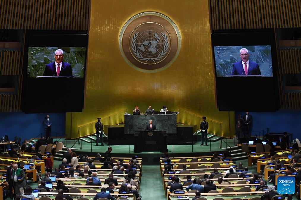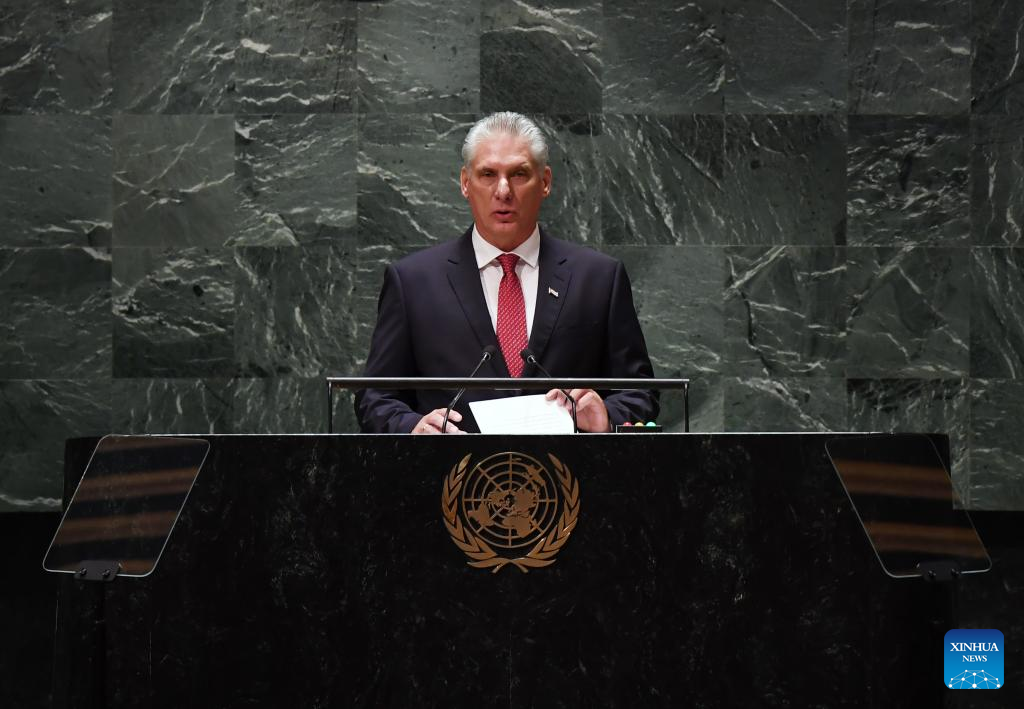 Cuban President Miguel Diaz-Canel Bermudez delivers a speech at the General Debate of the 78th session of the UN General Assembly at the UN headquarters in New York, on Sept. 19, 2023. The General Debate of the 78th session of the United Nations General Assembly opened at the UN headquarters in New York on Tuesday, focusing on restoring global trust and solidarity in current challenging time. Amidst the growing challenges of hunger and poverty, developing nations remain steadfast in their enduring struggle for a more just and equitable world, Cuban President Miguel Diaz-Canel Bermudez said at the General Debate of the UN General Assembly on Tuesday. (Xinhua/Li Rui)