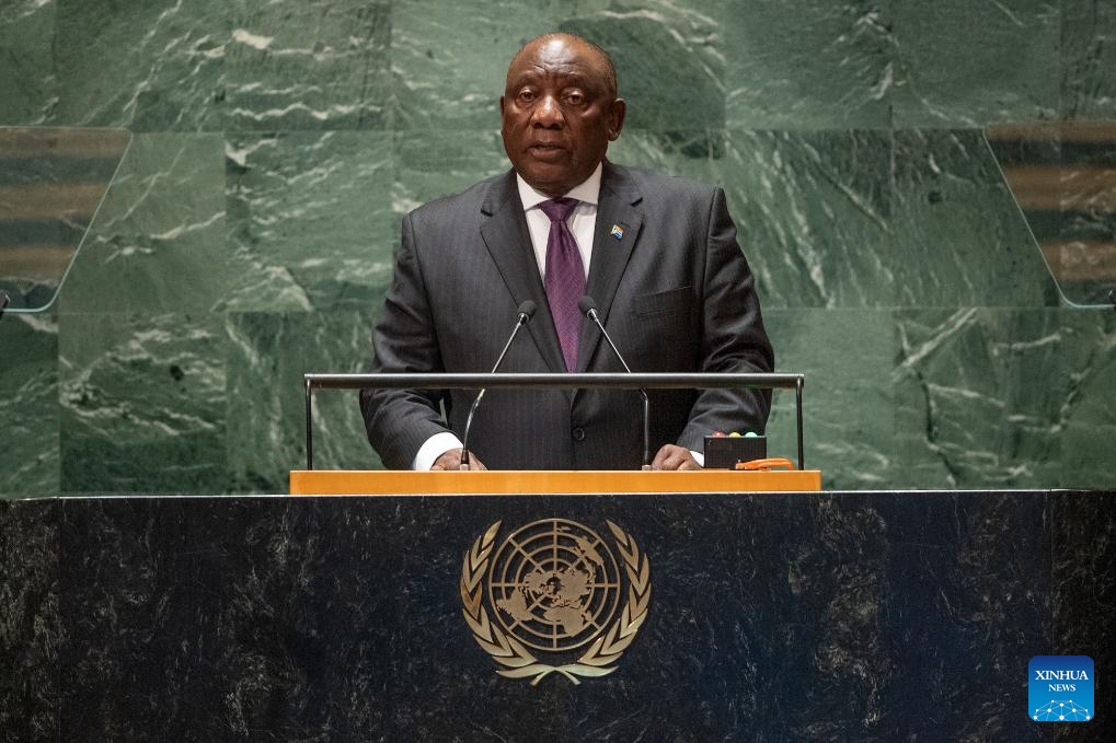 South African President Cyril Ramaphosa delivers a speech at the General Debate of the 78th session of the UN General Assembly at the UN headquarters in New York, on Sept. 19, 2023. The General Debate of the 78th session of the United Nations General Assembly opened at the UN headquarters in New York on Tuesday, focusing on restoring global trust and solidarity in current challenging time. South African President Cyril Ramaphosa on Tuesday deplored investment in war instead of livelihoods. (Cia Pak/UN Photo/Handout via Xinhua)