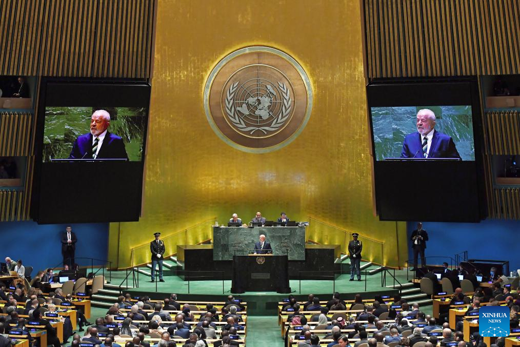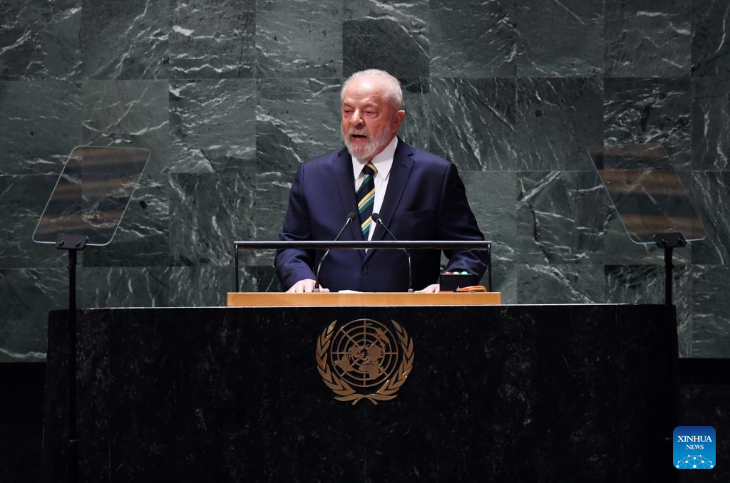 Brazilian President Luiz Inacio Lula da Silva delivers a speech at the General Debate of the 78th session of the UN General Assembly at the UN headquarters in New York, on Sept. 19, 2023. The General Debate of the 78th session of the United Nations General Assembly opened at the UN headquarters in New York on Tuesday, focusing on restoring global trust and solidarity in current challenging time. (Xinhua/Li Rui)