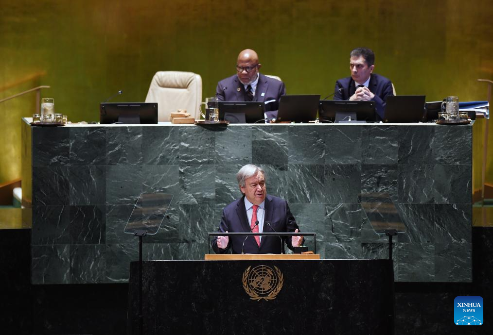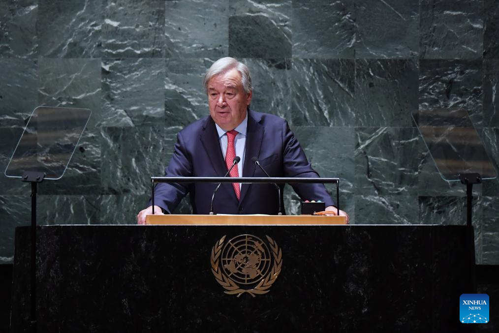 UN Secretary-General Antonio Guterres speaks at the opening of the General Debate of the 78th session of the UN General Assembly at the UN headquarters in New York, on Sept. 19, 2023. Guterres on Tuesday called for effective multilateral institutions to tackle global challenges. (Xinhua/Li Rui)