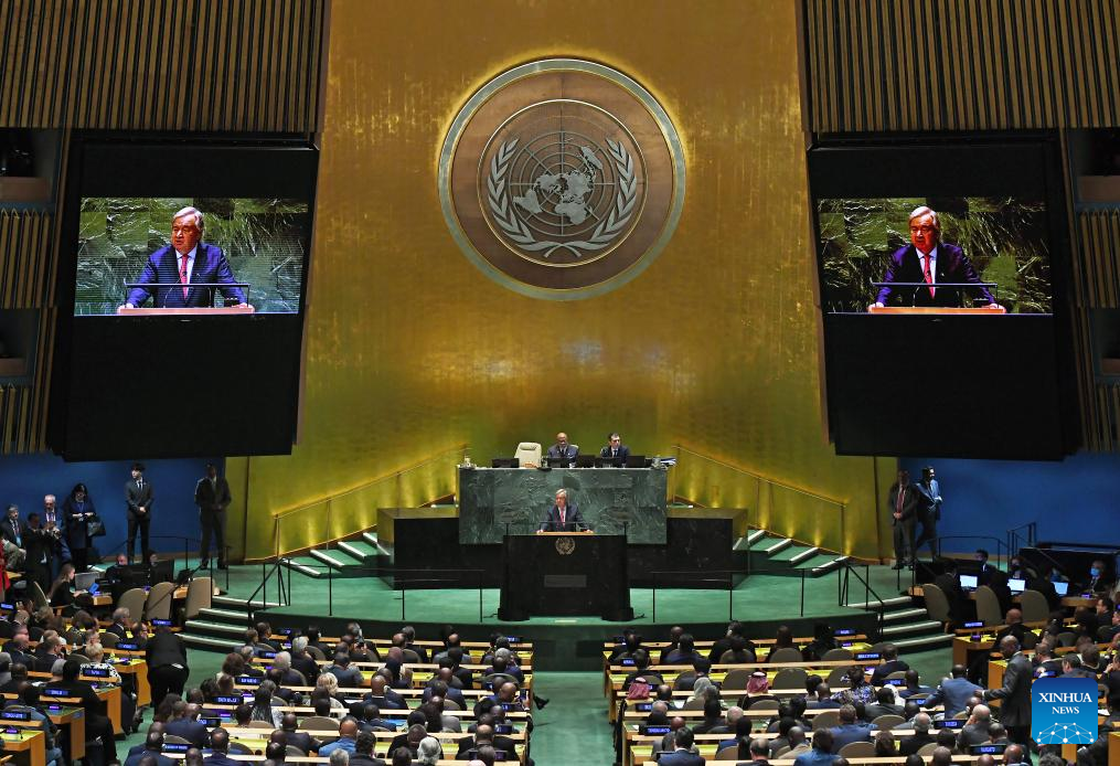 UN Secretary-General Antonio Guterres (Front) speaks at the opening of the General Debate of the 78th session of the UN General Assembly at the UN headquarters in New York, on Sept. 19, 2023. The General Debate of the 78th session of the United Nations General Assembly opened at the UN headquarters in New York on Tuesday, focusing on restoring global trust and solidarity in current challenging time. (Xinhua/Li Rui)