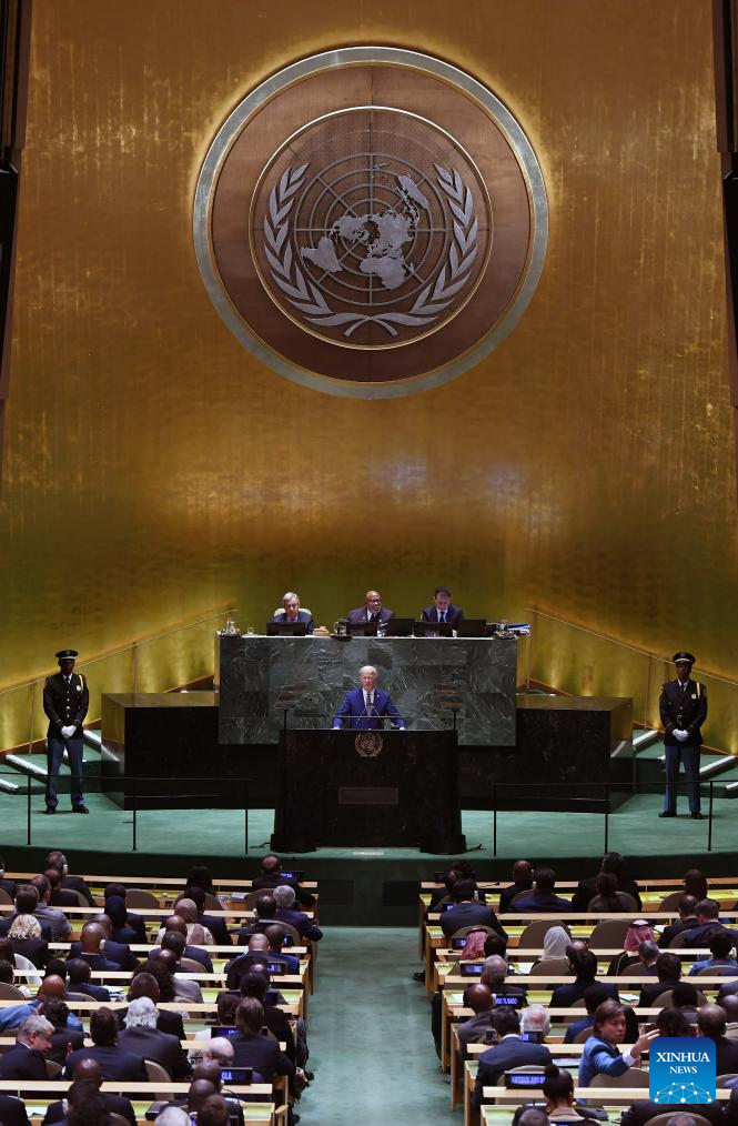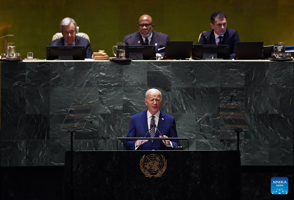 U.S. President Joe Biden (at the podium) delivers a speech at the General Debate of the 78th session of the UN General Assembly at the UN headquarters in New York, on Sept. 19, 2023. The General Debate of the 78th session of the United Nations General Assembly opened at the UN headquarters in New York on Tuesday, focusing on restoring global trust and solidarity in current challenging time. (Xinhua/Li Rui)