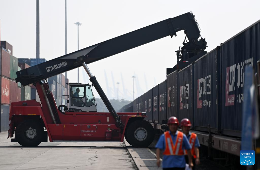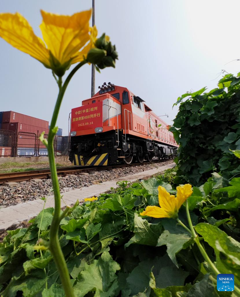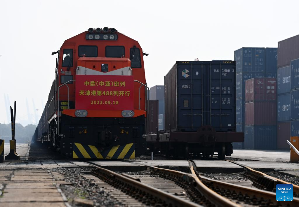 A freight train bound for Ulan Bator, Mongolia, pulls out of a station in Tianjin Port in north China's Tianjin, Sept. 18, 2023.?(Xinhua/Yin Gang)
