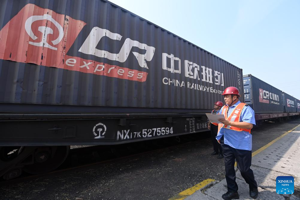 Staff members inspect a freight train at a station in Tianjin Port in north China's Tianjin, Sept. 18, 2023.?(Xinhua/Zhao Zishuo)