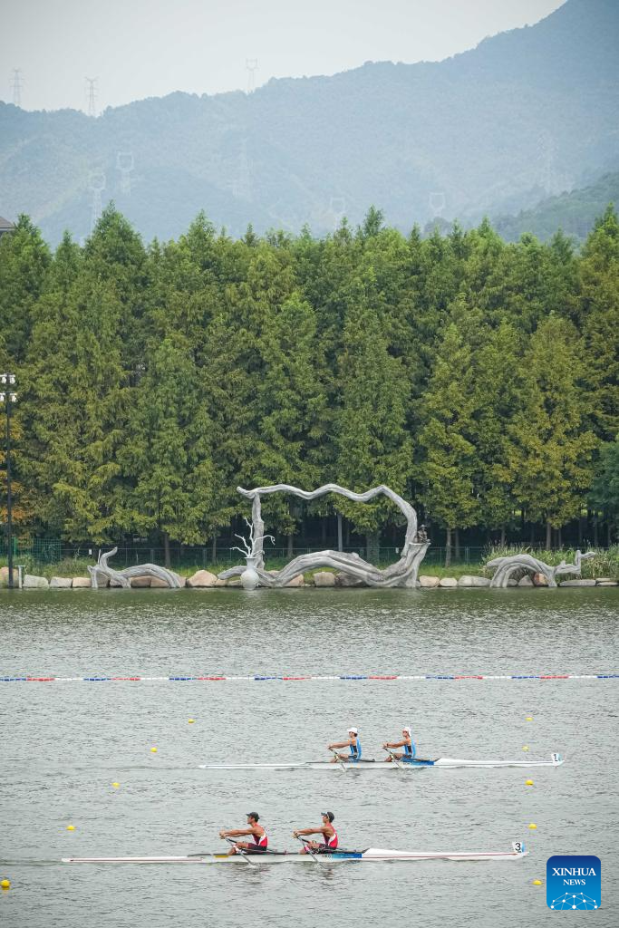 Chan Tik Lun (bottom R)/Chan Chi Fung (bottom L) of China's Hong Kong and Sim Hyunbo(top R)/Kang Jisu of South Korea compete during the Men's Light-Weight Double Sculls Heat of rowing at the 19th Asian Games in Hangzhou, east China's Zhejiang Province, Sept. 20, 2023. (Xinhua/Jiang Han)
