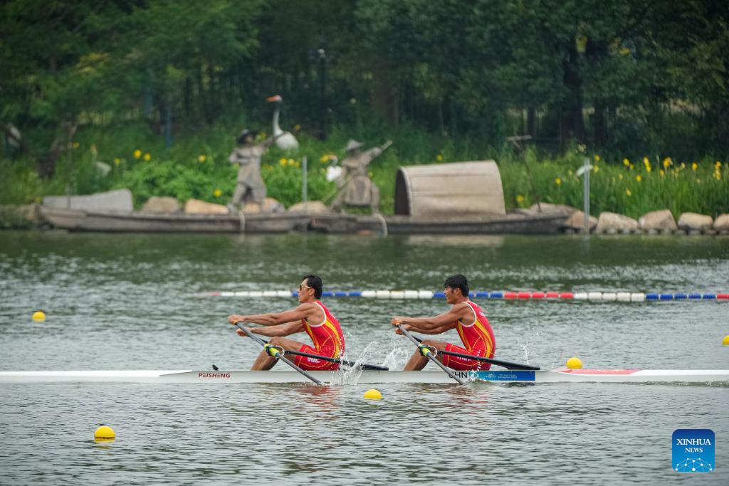 China's Liu Zhiyu (R) and Zhang Liang compete during the Men's Double Sculls Heat of rowing at the 19th Asian Games in Hangzhou, east China's Zhejiang Province, Sept. 20, 2023. (Xinhua/Jiang Han)