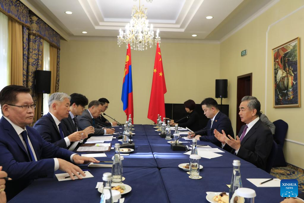 MOSCOW, Sept. 20 (Xinhua) -- China and Mongolia will work together to deepen bilateral security cooperation to promote their countries' development and safeguard regional peace and stability, said Wang Yi, member of the Political Bureau of the Communist Party of China Central Committee (CPCCC) and secretary of Mongolia's National Security Council Jadamba Enkhbayar Tuesday during their meeting here.