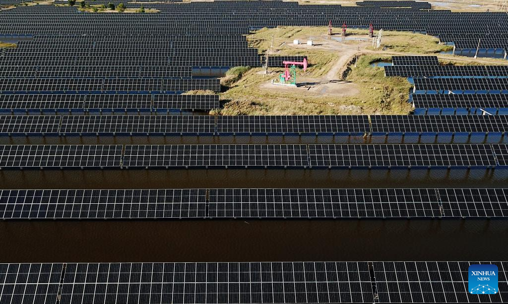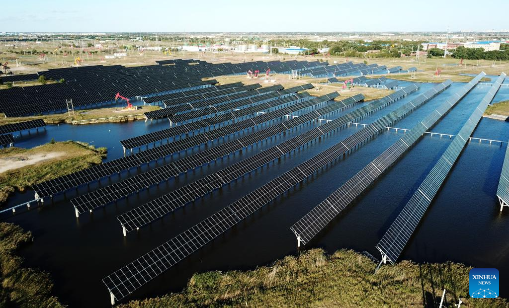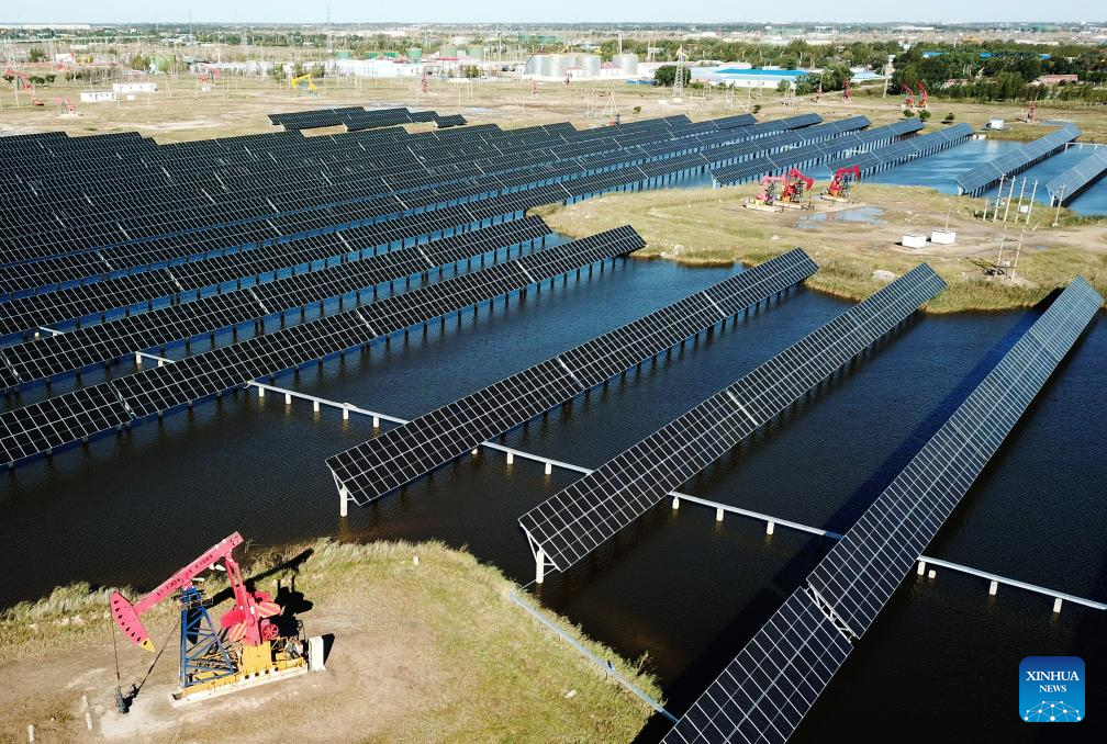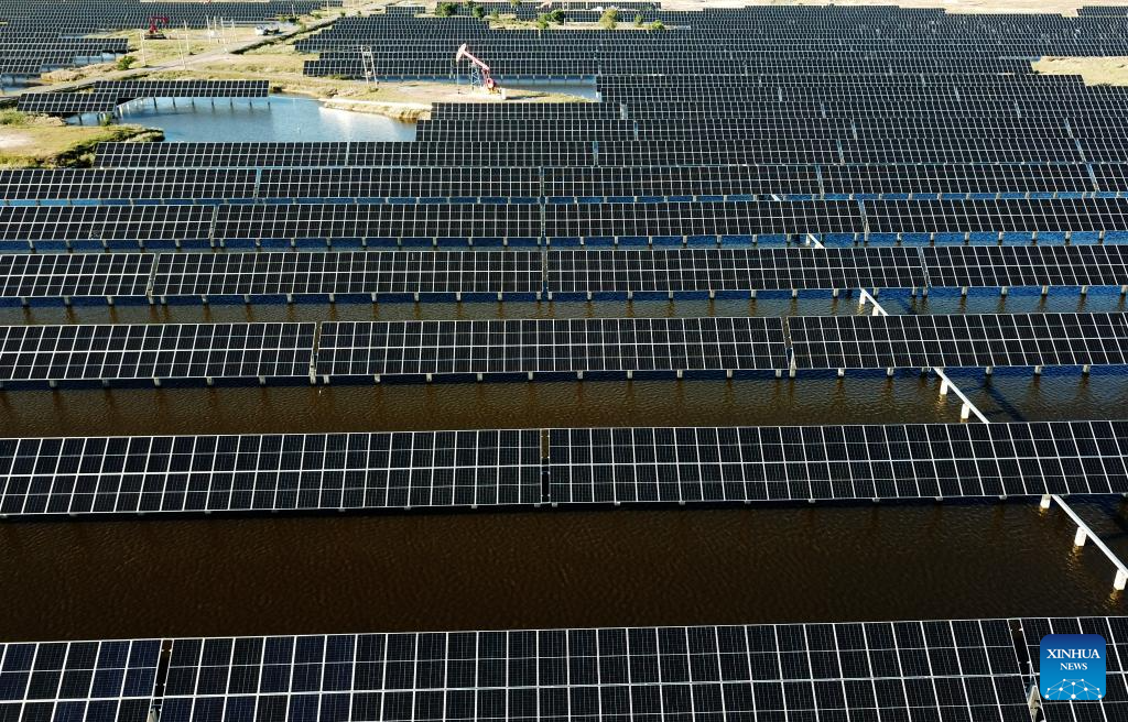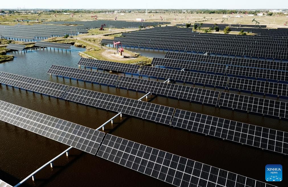 This aerial photo taken on Sept. 19, 2023 shows part of the Xinghuo water surface photovoltaic power station of Daqing Oilfield under PetroChina in Daqing, northeast China's Heilongjiang Province. This power station has an installed capacity of 18.73 megawatts, and its average annual electricity generation is equivalent to that produced by burning 8400 tonnes of standard coal, which in turn reduces carbon dioxide emissions by 22,000 tonnes. The station has yielded 33 million kWh of electricity since it was put into operation on June 30, 2022. (Xinhua/Wang Jianwei)