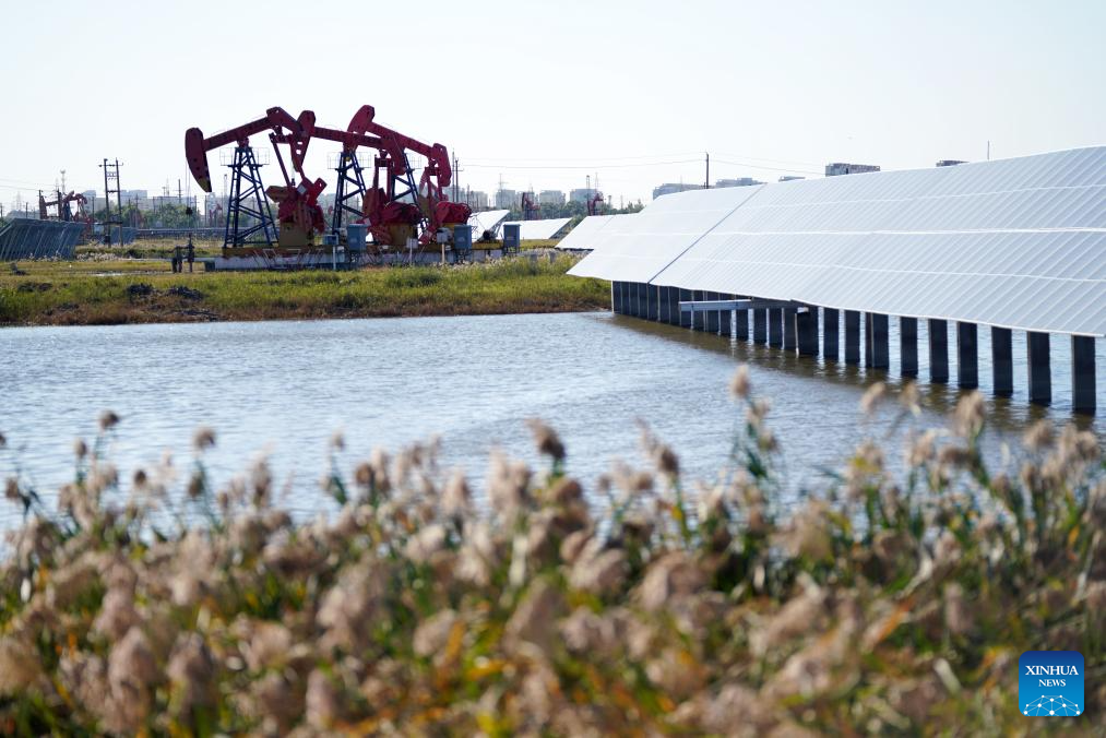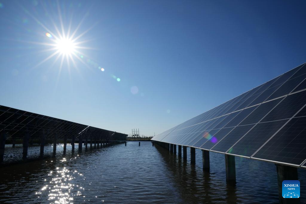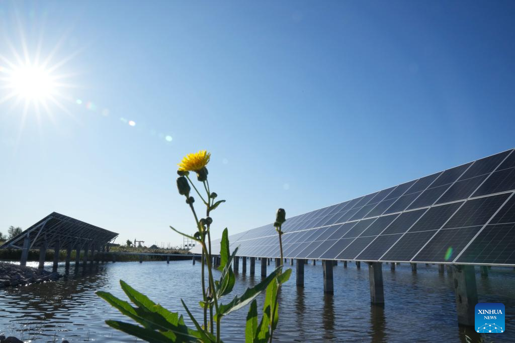 This photo taken on Sept. 19, 2023 shows part of the Xinghuo water surface photovoltaic power station of Daqing Oilfield under PetroChina in Daqing, northeast China's Heilongjiang Province. This power station has an installed capacity of 18.73 megawatts, and its average annual electricity generation is equivalent to that produced by burning 8400 tonnes of standard coal, which in turn reduces carbon dioxide emissions by 22,000 tonnes. The station has yielded 33 million kWh of electricity since it was put into operation on June 30, 2022. (Xinhua/Wang Jianwei)