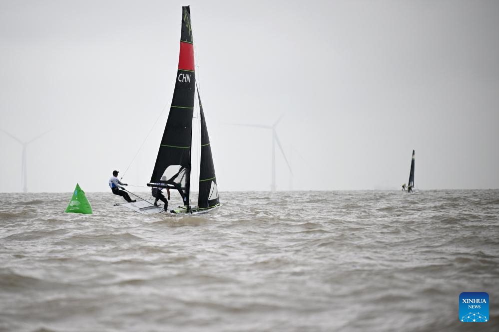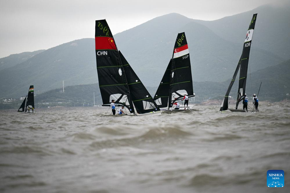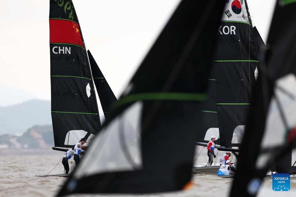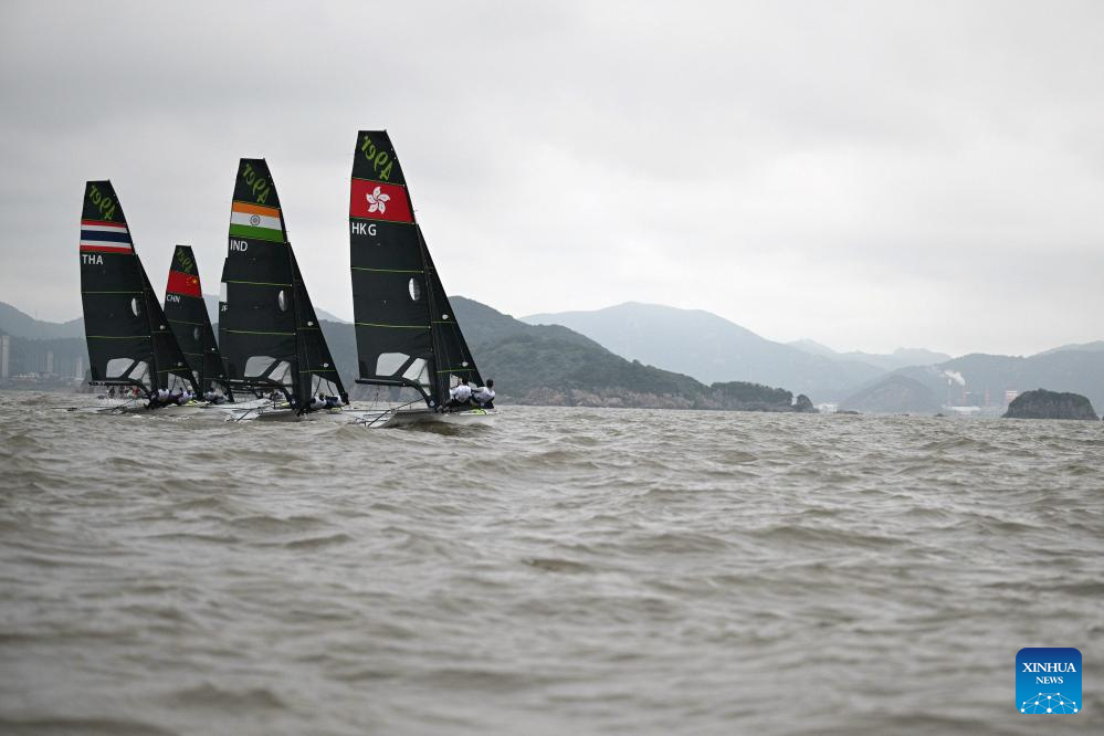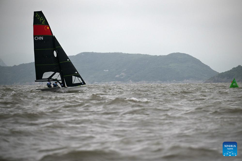 Athletes attend the Men's Skiff 49er Race of sailing at the 19th Asian Games in Ningbo, east China's Zhejiang Province, Sept. 21, 2023. (Xinhua/Chen Bin)