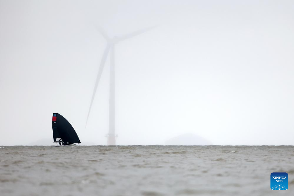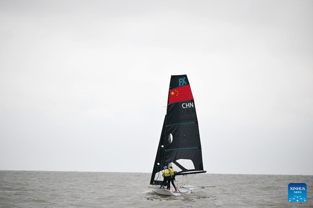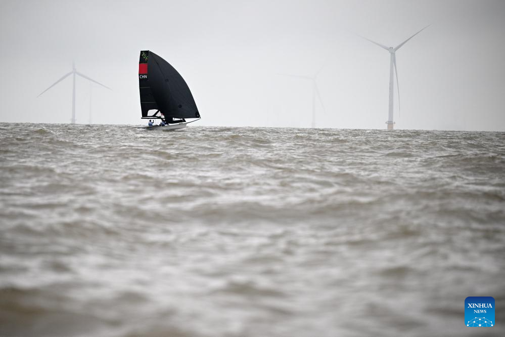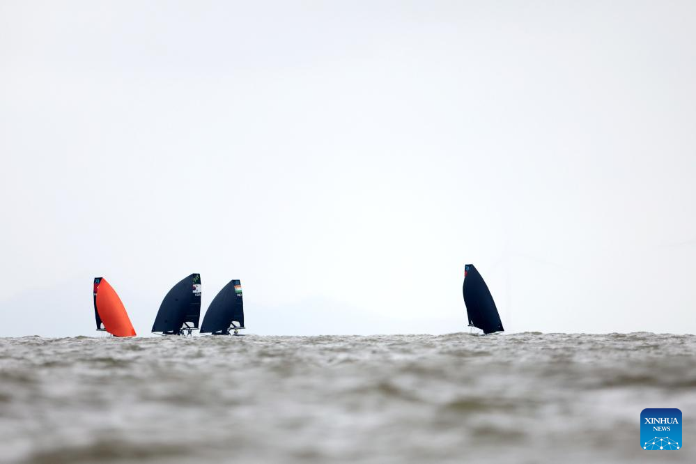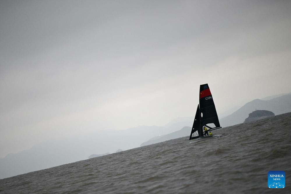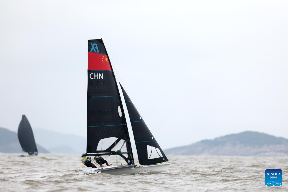 Athletes attend the Men's Skiff 49er Race of sailing at the 19th Asian Games in Ningbo, east China's Zhejiang Province, Sept. 21, 2023. (Xinhua/Chen Bin)