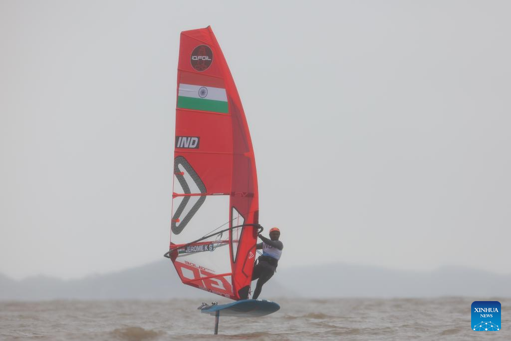 Jerome Kumar Savarimuthu of India competes during the Men's Windsurfing iQFoil Race at the 19th Asian Games in Ningbo, east China's Zhejiang Province, Sept. 21, 2023. (Xinhua/Zhang Tao)