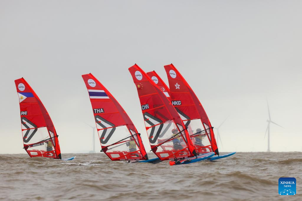 Huang Xianting (3rd R) of China competes during the Women's Windsurfing iQFoil Race at the 19th Asian Games in Ningbo, east China's Zhejiang Province, Sept. 21, 2023. (Xinhua/Zhang Tao)