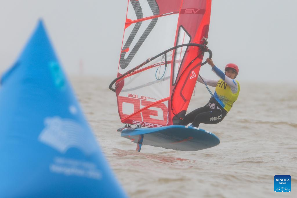 Huang Xianting of China competes during the Women's Windsurfing iQFoil Race at the 19th Asian Games in Ningbo, east China's Zhejiang Province, Sept. 21, 2023. (Xinhua/Zhang Tao)