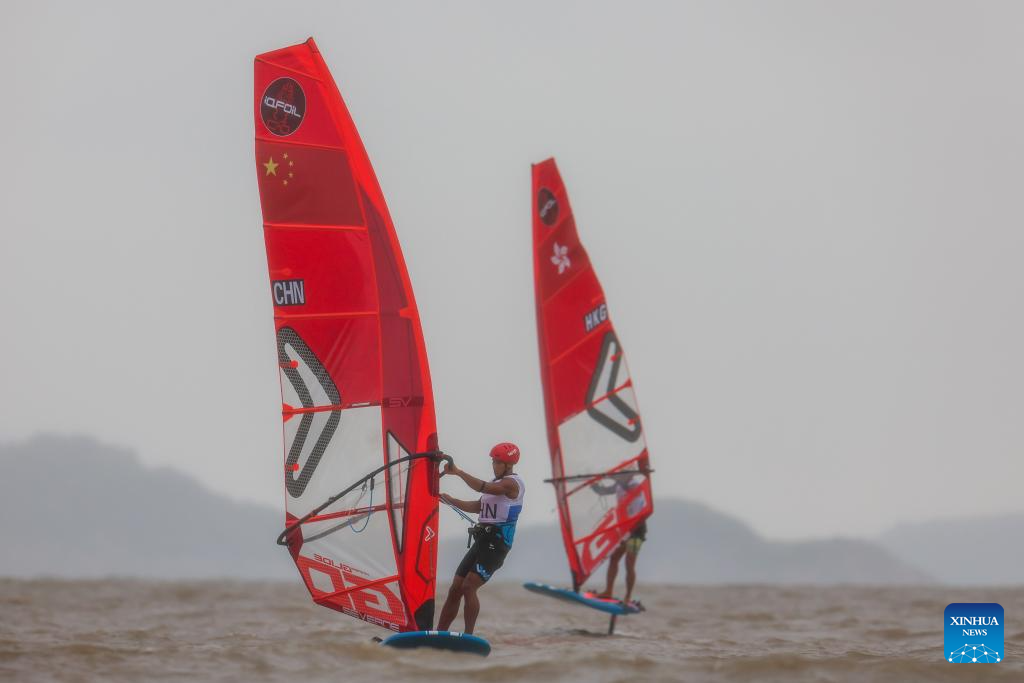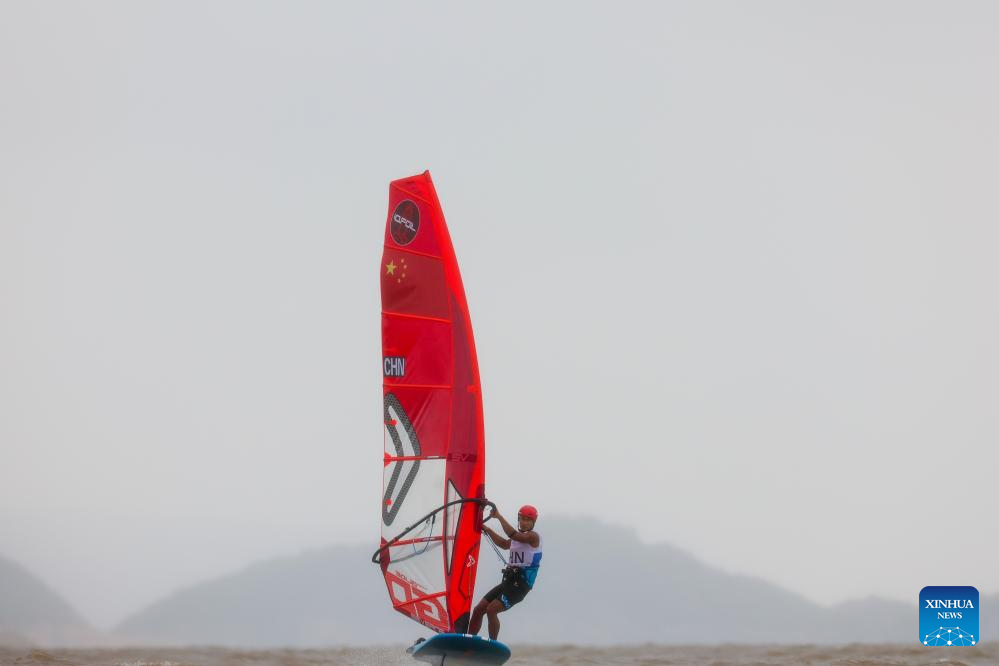 China's Bi Kun competes during the Men's Windsurfing iQFoil Race at the 19th Asian Games in Ningbo, east China's Zhejiang Province, Sept. 21, 2023. (Xinhua/Zhang Tao)