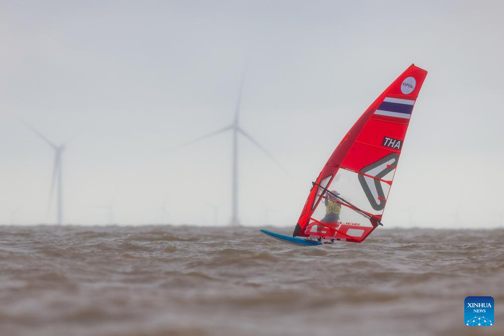 Aticha Homraruen of Thailand competes during the Women's Windsurfing iQFoil Race at the 19th Asian Games in Ningbo, east China's Zhejiang Province, Sept. 21, 2023. (Xinhua/Zhang Tao)