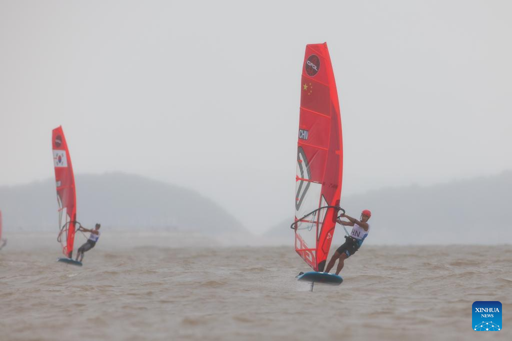 China's Bi Kun (1st R) competes during the Men's Windsurfing iQFoil Race at the 19th Asian Games in Ningbo, east China's Zhejiang Province, Sept. 21, 2023. (Xinhua/Zhang Tao)