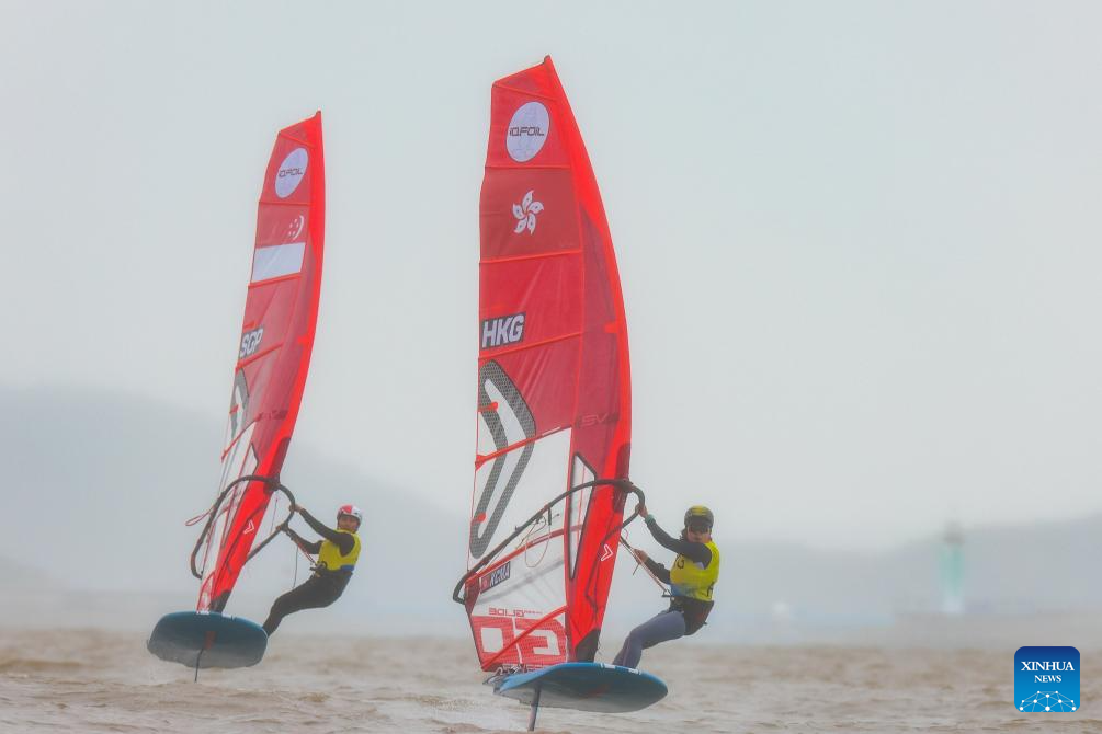 Ma Kwan Ching (R) of China's Hong Kong competes during the Women's Windsurfing iQFoil Race at the 19th Asian Games in Ningbo, east China's Zhejiang Province, Sept. 21, 2023. (Xinhua/Zhang Tao)