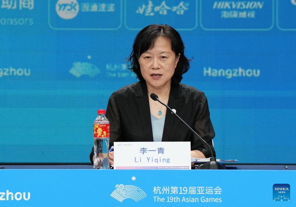Li Yiqing, Spokesperson for the Hangzhou Asian Games Opening and Closing Ceremonies Operations Centre, speaks at a press conference on the preparations for the opening ceremony of the Hangzhou Asian Games in Hangzhou, east China's Zhejiang Province, Sept. 21, 2023. (Xinhua/Li Yibo)
