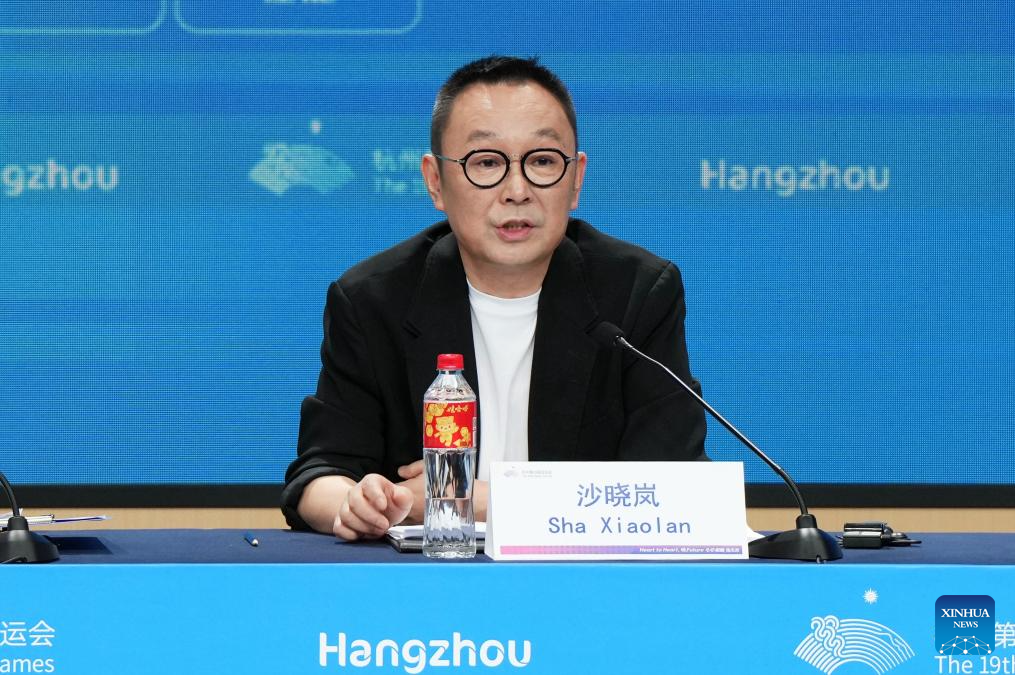 Sha Xiaolan, Chief Director and Chief Producer for the Hangzhou Asian Games Opening Ceremony, speaks at a press conference on preparations for the opening ceremony in Hangzhou, east China's Zhejiang Province, Sept. 21, 2023. (Xinhua/Li Yibo)