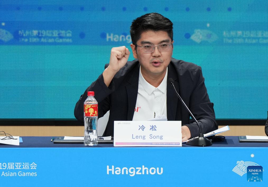 Leng Song, Chief Writer for the Hangzhou Asian Games Opening Ceremony, speaks at a press conference on preparations for the opening ceremony in Hangzhou, east China's Zhejiang Province, Sept. 21, 2023. (Xinhua/Li Yibo)