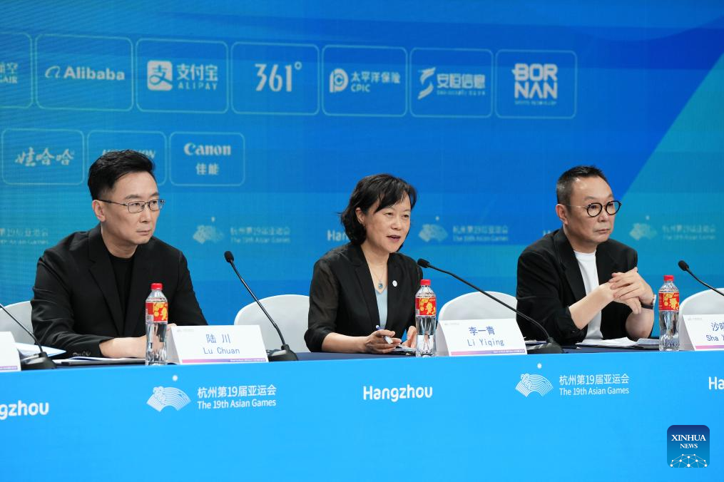 Li Yiqing (C), Spokesperson for the Hangzhou Asian Games Opening and Closing Ceremonies Operations Centre, speaks at a press conference on the preparations for the opening ceremony of the Hangzhou Asian Games in Hangzhou, east China's Zhejiang Province, Sept. 21, 2023. (Xinhua/Li Yibo)
