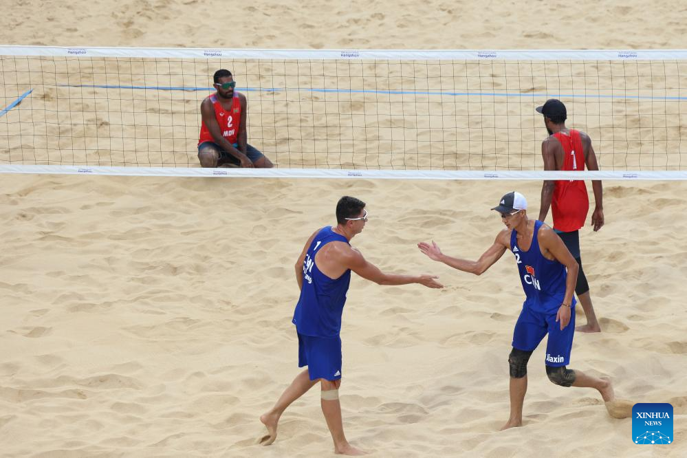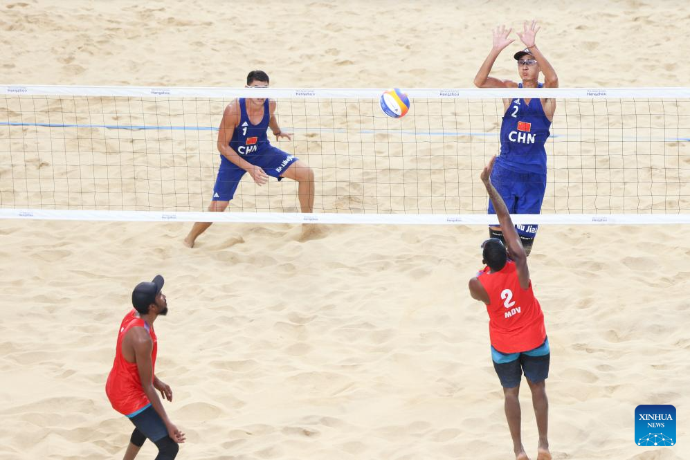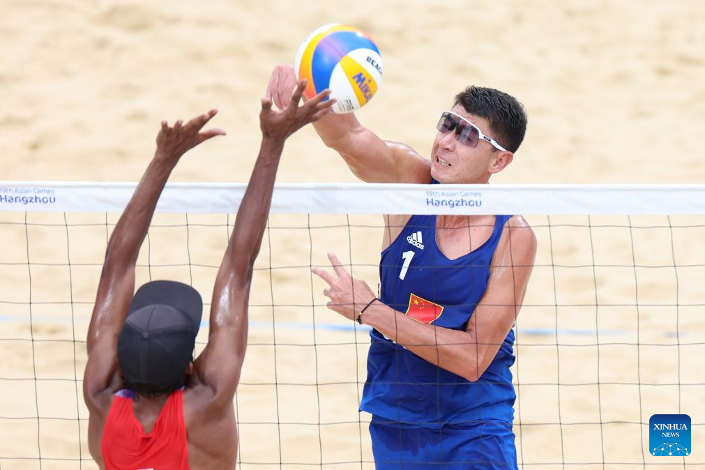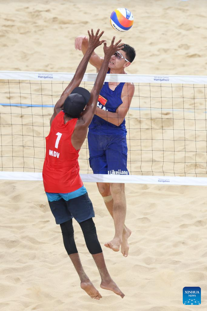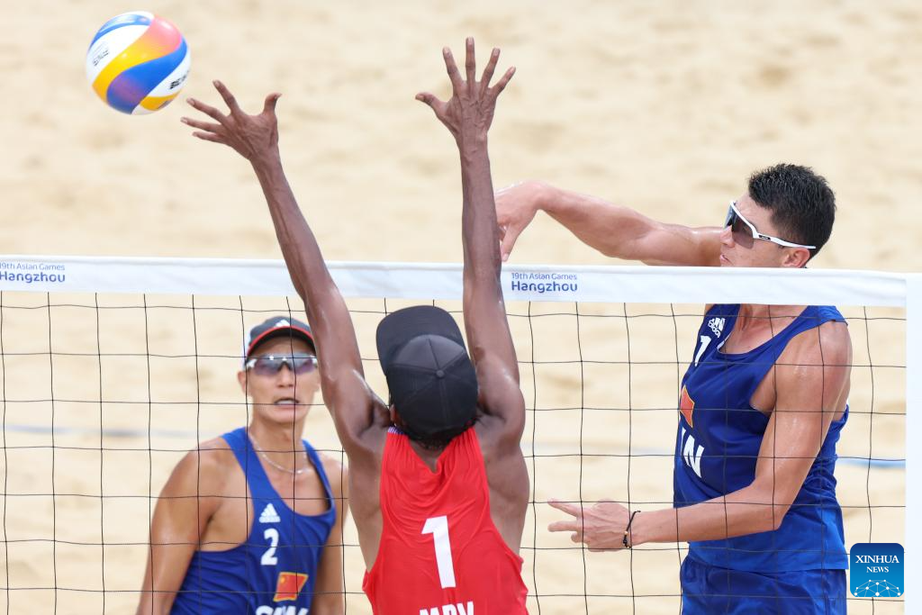 Abuduhalikejiang Mutailipu (R) of China spikes the ball during the men's beach volleyball preliminary match between Abuduhalikejiang Mutailipu/Wu Jiaxin of China and Sajid Ismail/Adam Naseem of Maldives at the 19th Asian Games in Ningbo, east China's Zhejiang Province, Sept. 21, 2023. (Xinhua/Zhang Tao)