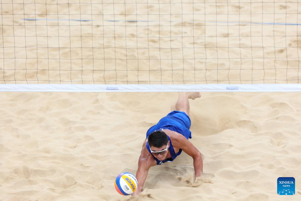 Abuduhalikejiang Mutailipu of China saves the ball during the men's beach volleyball preliminary match between Abuduhalikejiang Mutailipu/Wu Jiaxin of China and Sajid Ismail/Adam Naseem of Maldives at the 19th Asian Games in Ningbo, east China's Zhejiang Province, Sept. 21, 2023. (Xinhua/Zhang Tao)