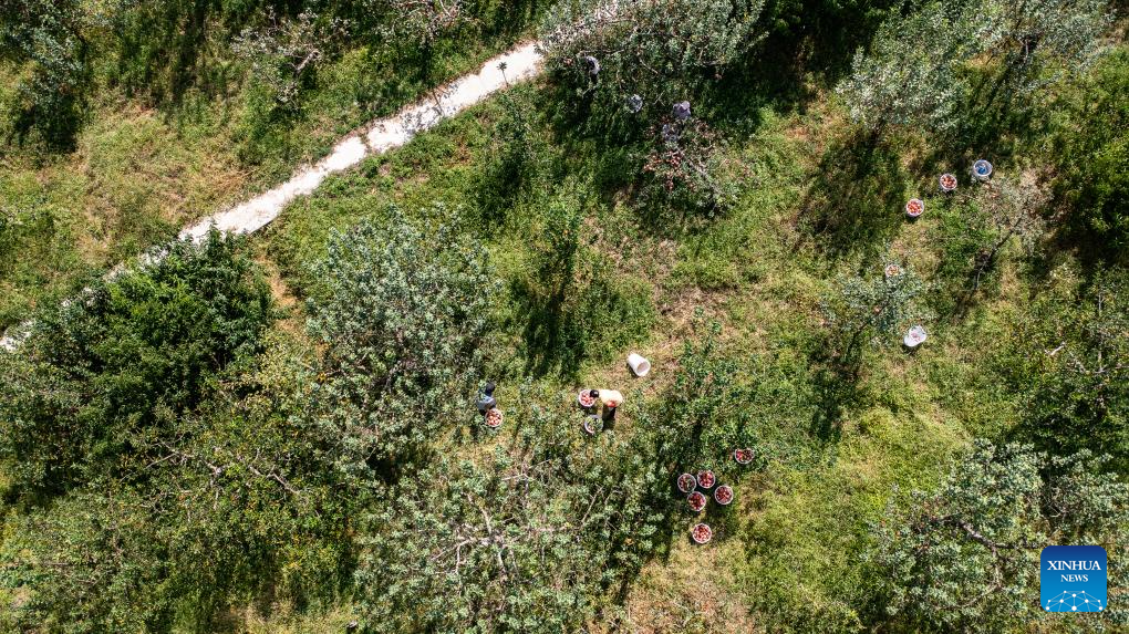 This aerial photo taken on Sept. 20, 2023 shows villagers harvesting apples in Xiejia Village in Weining Yi-Hui-Miao Autonomous County, southwest China's Guizhou Province. Local farmers are busy picking and packing apples in the harvest season to meet the market demand. (Xinhua/Tao Liang)
