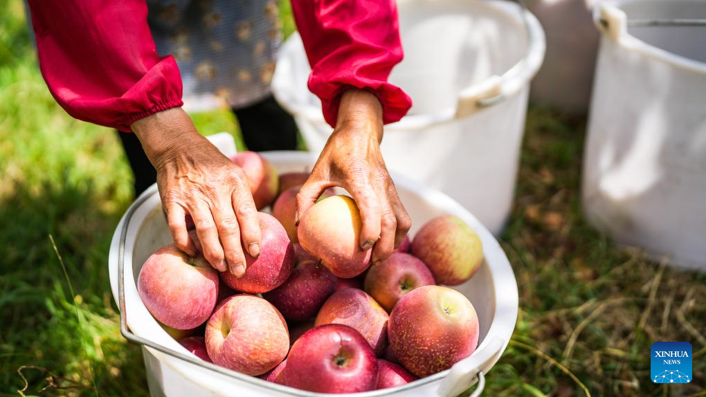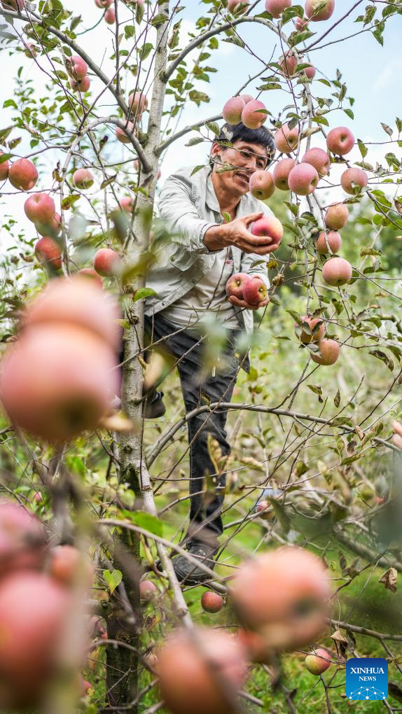 A villager harvests apples in Xiejia Village in Weining Yi-Hui-Miao Autonomous County, southwest China's Guizhou Province, Sept. 20, 2023. Local farmers are busy picking and packing apples in the harvest season to meet the market demand. (Xinhua/Tao Liang)