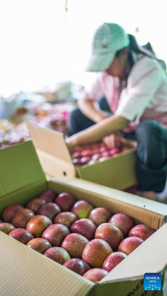 A villager packs apples in Xiejia Village in Weining Yi-Hui-Miao Autonomous County, southwest China's Guizhou Province, Sept. 20, 2023. Local farmers are busy picking and packing apples in the harvest season to meet the market demand. (Xinhua/Tao Liang)