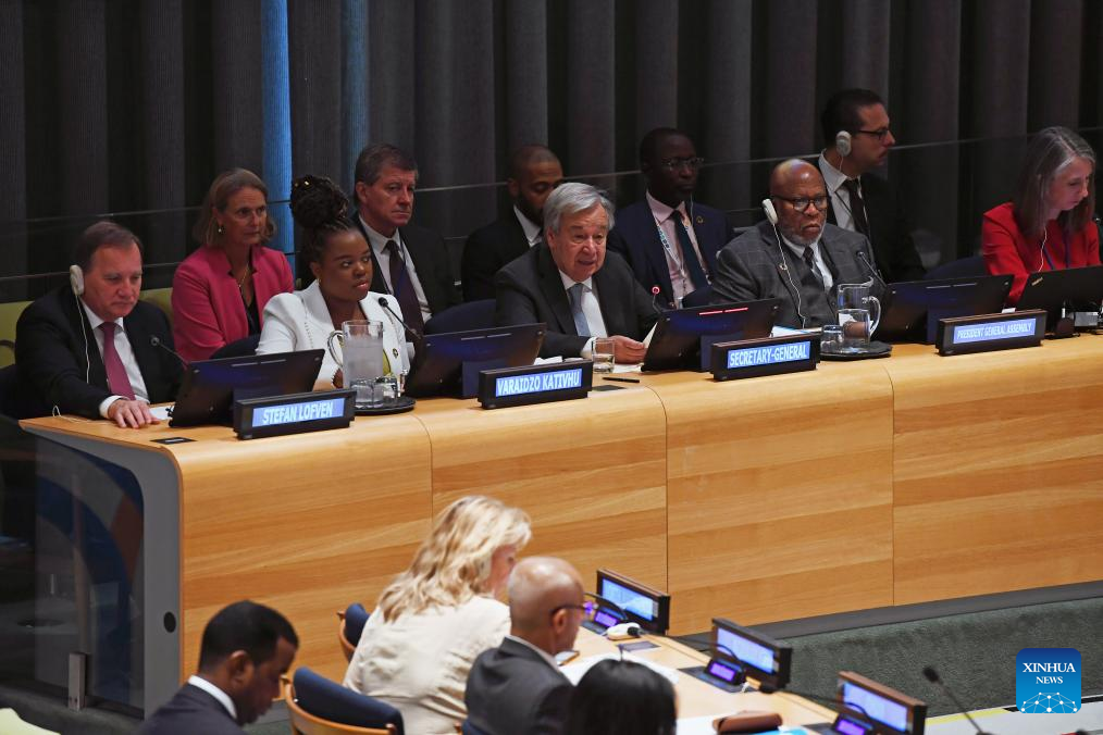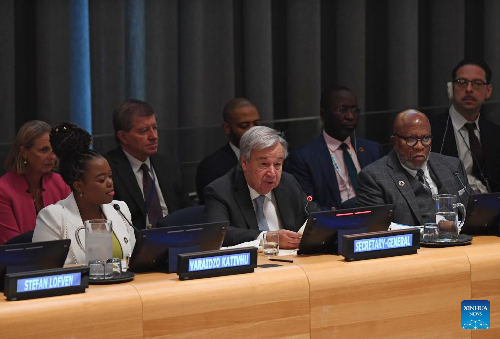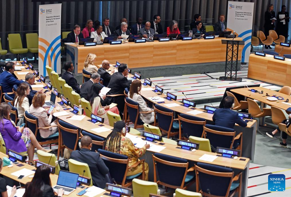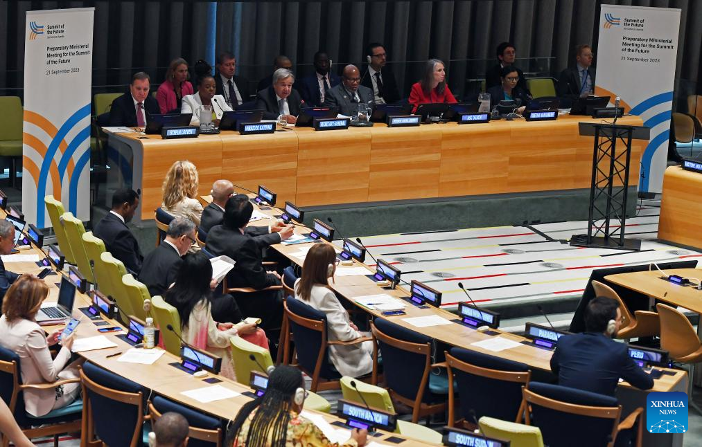 UN Secretary-General Antonio Guterres (C, Front) speaks at a preparatory ministerial meeting for the Summit of the Future at the UN headquarters in New York, on Sept. 21, 2023. Guterres on Thursday stressed the importance of multilateral institutions that match a multipolar world that is in the making. (Xinhua/Li Rui)