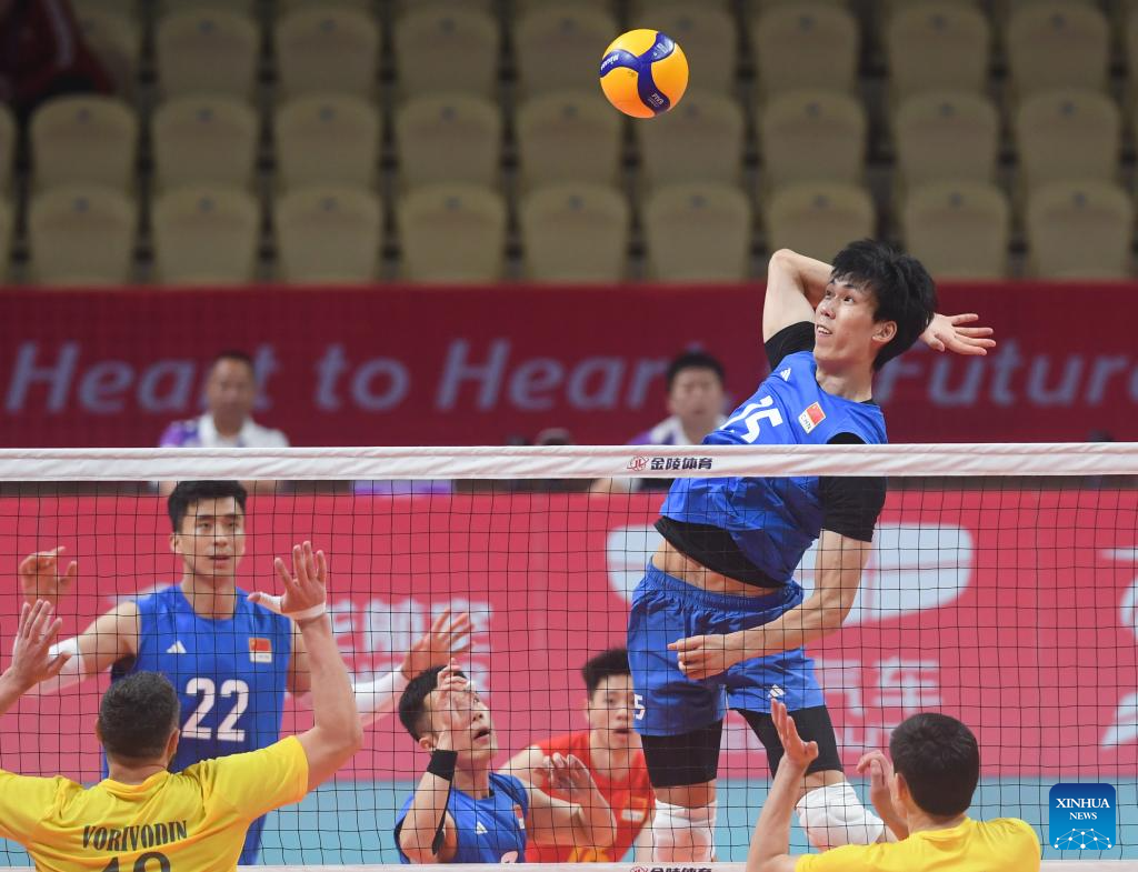 Peng Shikun (top) of China spikes the ball during the Volleyball Men's Preliminary Round Pool A match between China and Kazakhstan at the 19th Asian Games in Shaoxing, east China's Zhejiang Province, Sept. 21, 2023. (Xinhua/Weng Xinyang)
