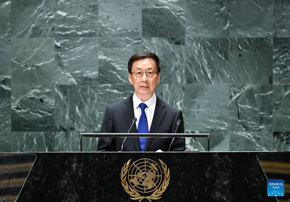 Chinese Vice President Han Zheng delivers a speech at the General Debate of the 78th session of the United Nations General Assembly (UNGA) at the United Nations headquarters in New York, Sept. 21, 2023. (Xinhua/Shen Hong)