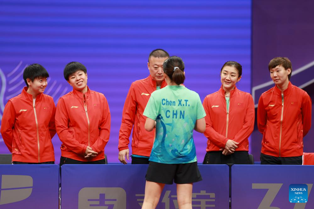 Chen Xingtong (front) of China talks with coach Ma Lin during the women's team preliminary group A match between China and China's Macao at the 19th Asian Games in Hangzhou, east China's Zhejiang Province, Sept. 22, 2023. (Xinhua/Liu Xu)