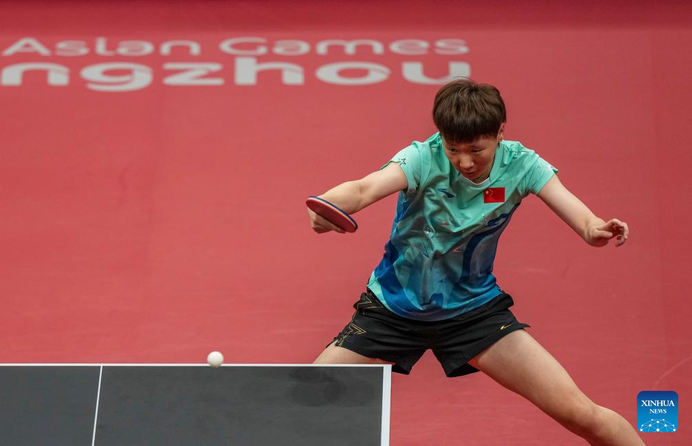 Chen Xingtong of China competes against Kuan Cheok Lam of China's Macao during the women's team preliminary group A match between China and China's Macao at the 19th Asian Games in Hangzhou, east China's Zhejiang Province, Sept. 22, 2023. (Xinhua/Liu Xu)