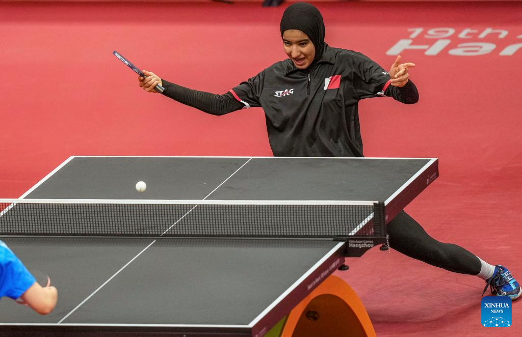 Maryam Abdulla Majeed Alaali of Bahrain hits a return to Lee Ho Ching of China's Hong Kong during the women's team preliminary group E match between Bahrain and China's Hong Kong at the 19th Asian Games in Hangzhou, east China's Zhejiang Province, Sept. 22, 2023. (Xinhua/Sun Fei)