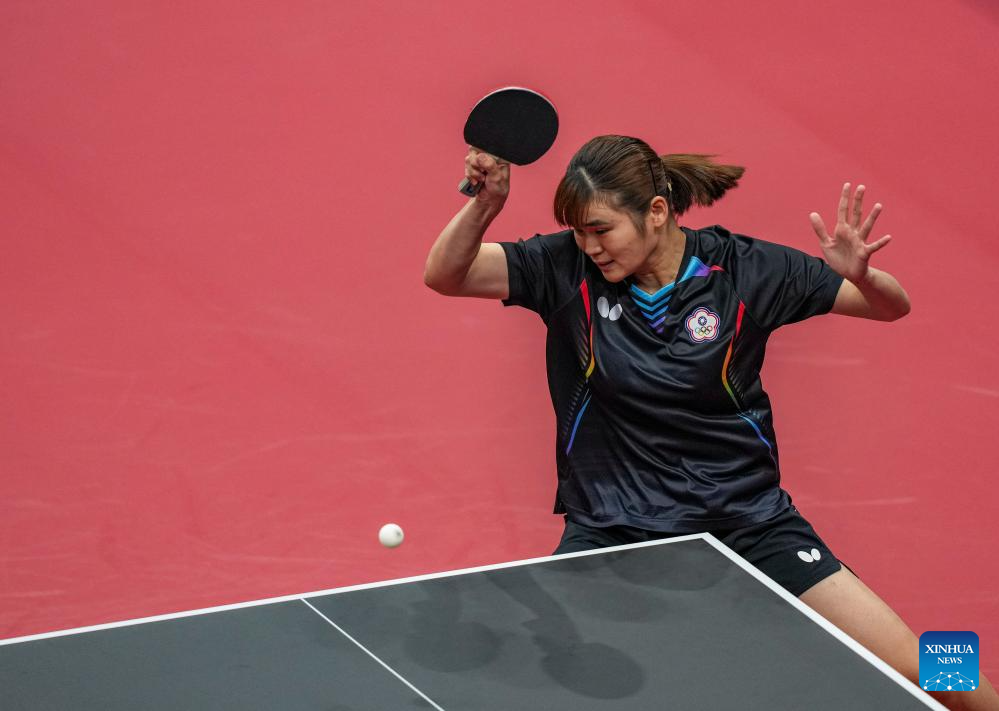 Wang Manyu of China hits a return to Cheong Chi Hun of China's Macao during the women's team preliminary group A match between China and China's Macao at the 19th Asian Games in Hangzhou, east China's Zhejiang Province, Sept. 22, 2023. (Xinhua/Sun Fei)