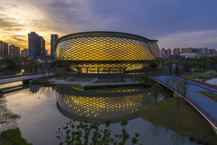 Surrounded by a crystal-clear river and lush trees, this venue is the first sports facility in Zhejiang Province to receive a three-star green building design certification, symbolizing the green ethos of the Hangzhou Asian Games.