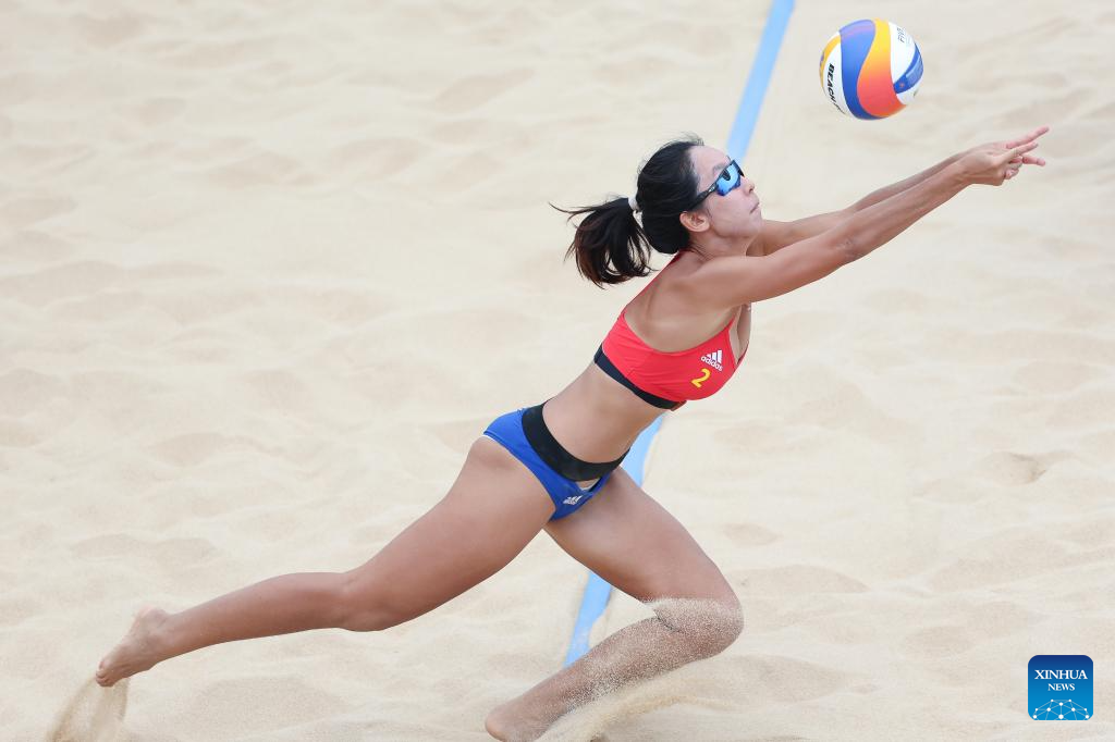 Dong Jie of China passes the ball during the women's beach volleyball preliminary match between Wang Fan/Dong Jie of China and Alina Rachenko/Anastassiya Ukolova of Kazakhstan at the 19th Asian Games in Ningbo, east China's Zhejiang Province, Sept. 22, 2023. (Xinhua/Zhang Tao)