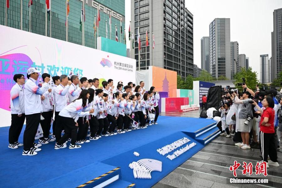 Members of the South Korea delegation pose for photos after the welcome ceremony at the 19th Asian Games Village in Hangzhou, east China's Zhejiang Province, Sept. 21, 2023. (Photo: China News Service/Zhao Wenyu)