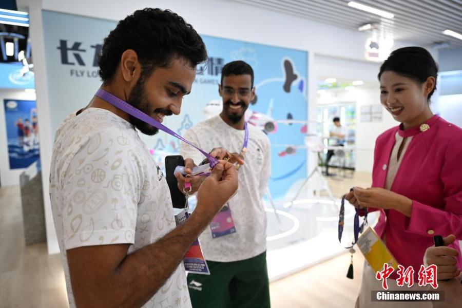 An athlete of Saudi Arabia and a staff member exchange pins at the 19th Asian Games Village in Hangzhou, east China's Zhejiang Province, Sept. 21, 2023. (Photo: China News Service/Zhao Wenyu)