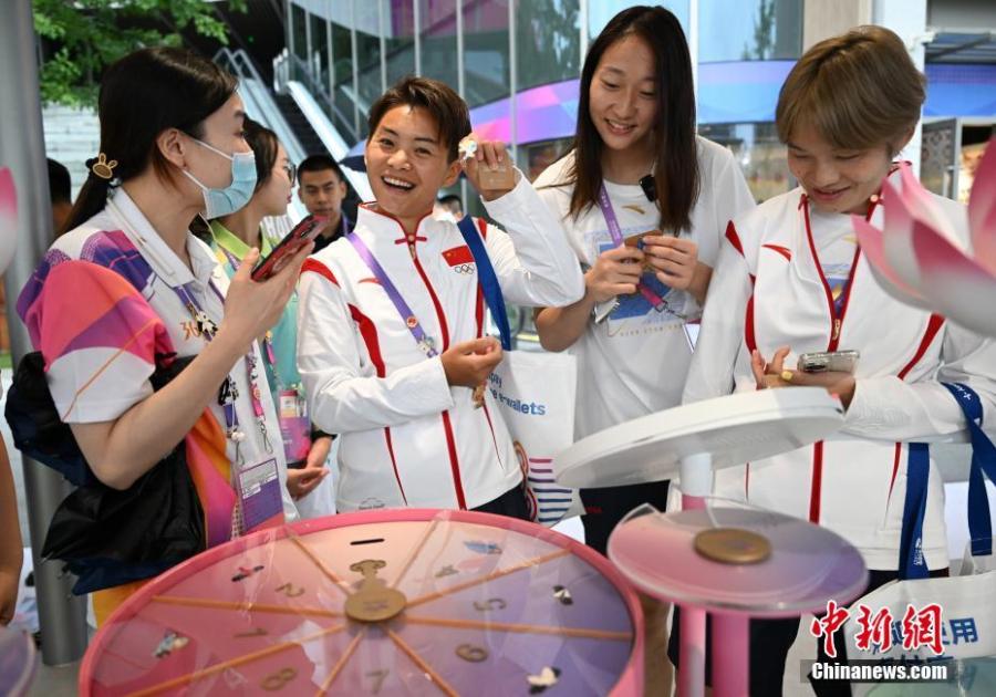 Wang Shuang of China displays her newly exchanged pin at the 19th Asian Games Village in Hangzhou, east China's Zhejiang Province, Sept. 21, 2023. (Photo: China News Service/Zhao Wenyu)