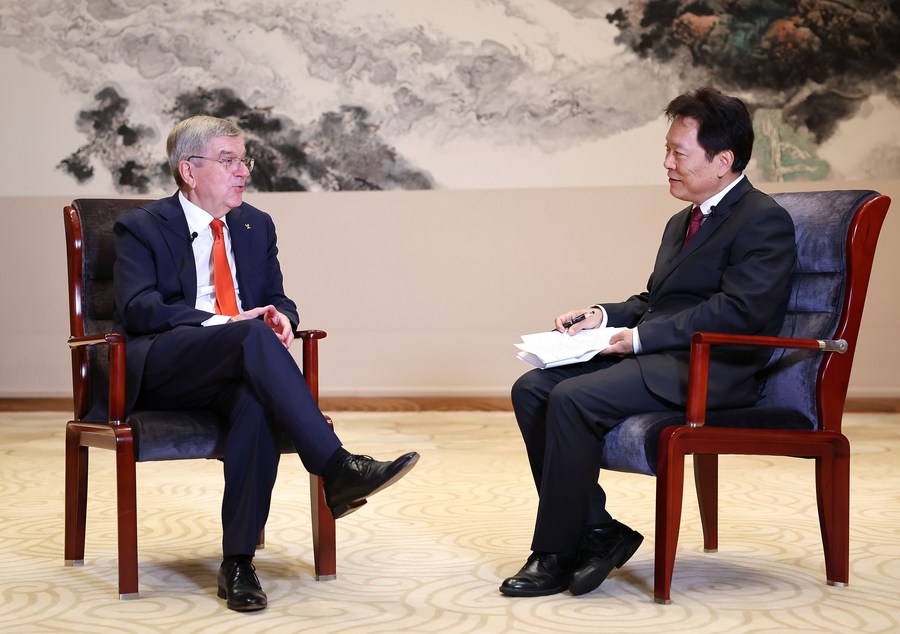 International Olympic Committee president Thomas Bach (L) speaks during an interview with Xinhua in Hangzhou on Sept. 22, 2023. (Xinhua/Cao Can)