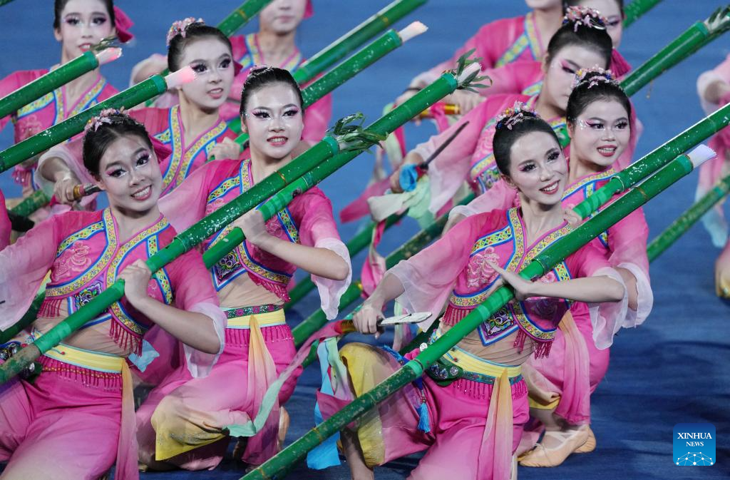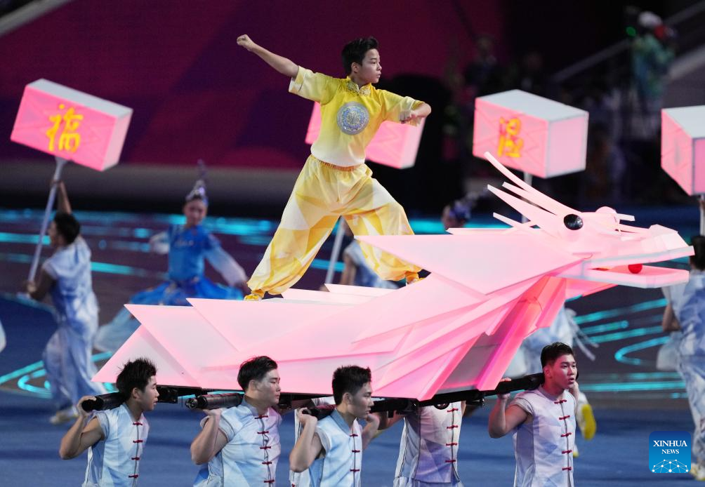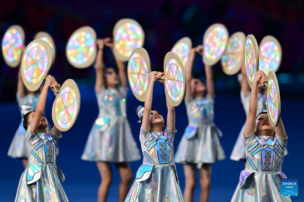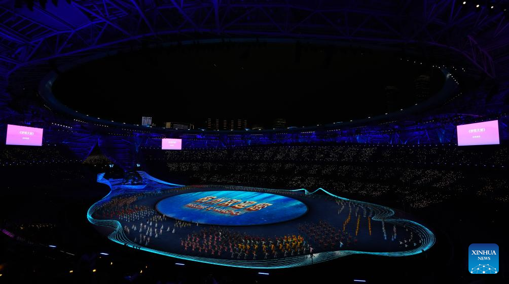Artists perform before the opening ceremony of the 19th Asian Games at the Hangzhou Olympic Sports Center Stadium in Hangzhou, east China's Zhejiang Province, Sept. 23, 2023. (Xinhua/Jiang Wenyao)